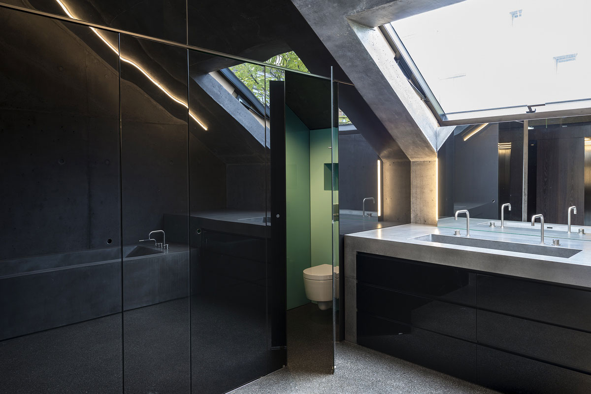 Alle Einbauten flächenbündig grifflos raumhoch-nahtlos in Baukörper integriert